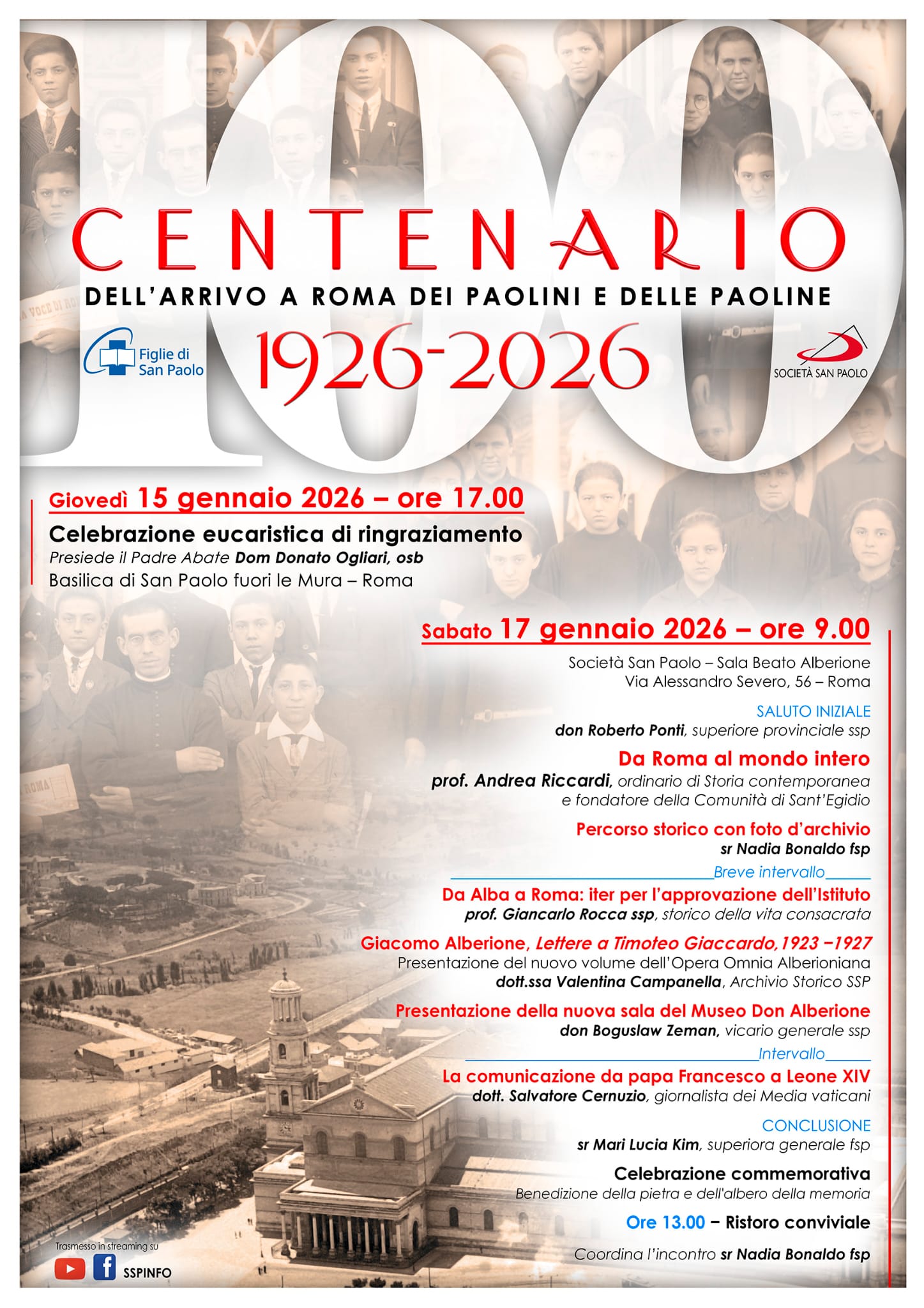 Il 15 e il 17 gennaio i Paolini e le Paoline hanno celebrato il centenario dell’arrivo della Famiglia Paolina a Roma. Nel 1926, i primi gruppi di giovani partirono da Alba accompagnati da don Timoteo Giaccardo e da maestra Amalia Peyrolo, con il desiderio di giungere nel cuore della cristianità per rafforzare lo slancio missionario e portare il Vangelo al mondo, sull’esempio di san Paolo.